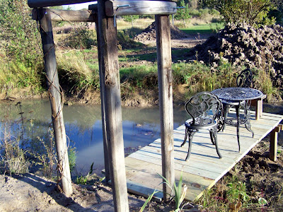 I have some rustic posts salvaged and I'm planning on putting an arbor on the North bank at the end of the dock (or bridge) and I have a grapevine ordered and an apricot tree, and hope to put the grapevine over a rustic arbor on the North bank, that you would walk through to reach the dock/bridge, and then plant the apricot tree up on the bank as well nearby. I had to move two shrubs that were right in the walkway at the end of the dock as they would have blocked access to it, one was a golden chamaecyparis and i moved it slightly to the east of the area where the arbor will be, and the other was a red leaf barberry, full size, and I moved it to the south west , so it won't scratch people walking onto the dock..but it will still be very nearby and will be a pretty accent in that area.